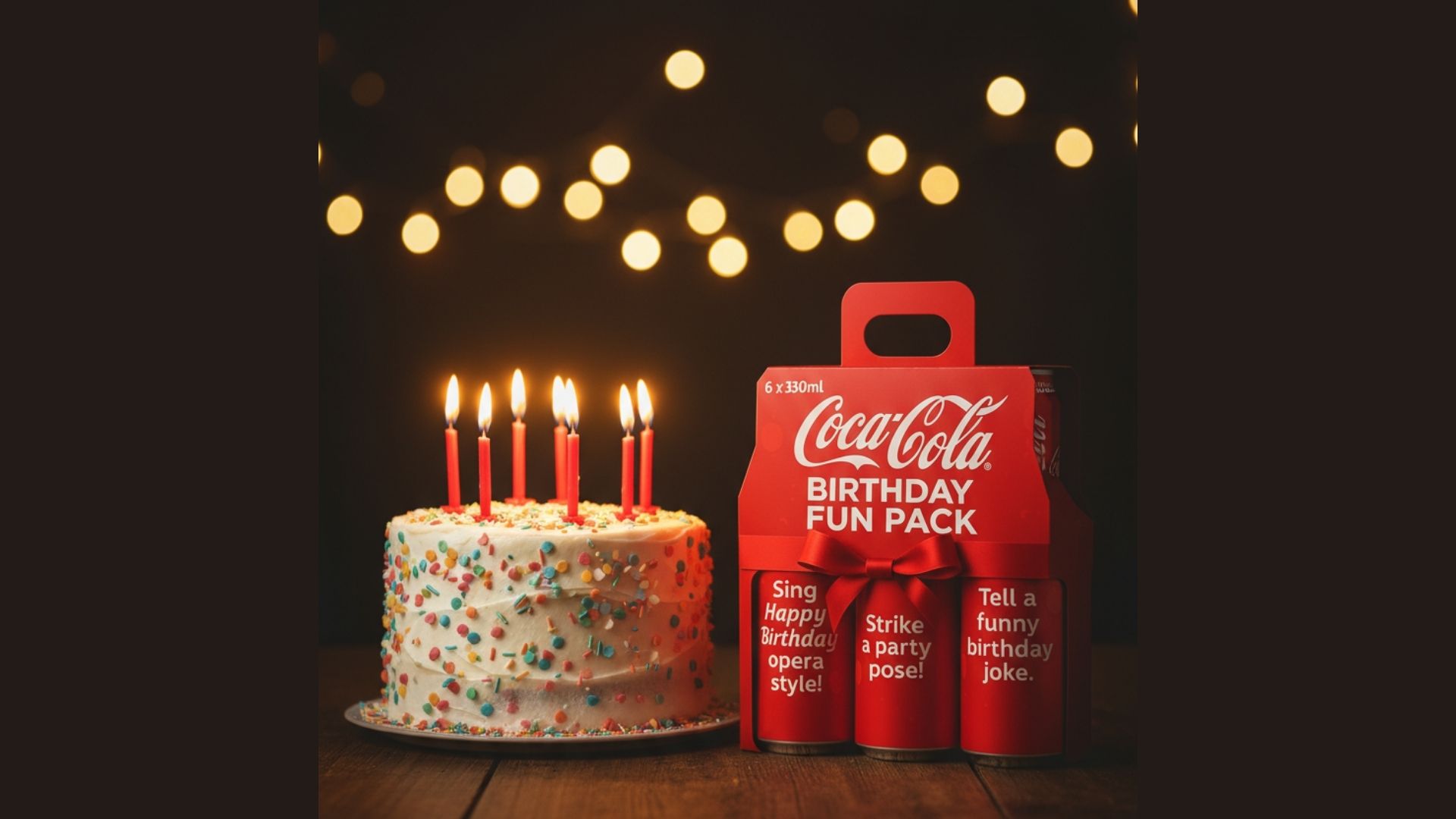 An AI-powered reimagining of Coca-Cola’s static ads, blending sharp brand analysis with bold creative execution. The result: a fresh, social-first idea "The Coca-Cola Birthday Fun Pack"